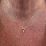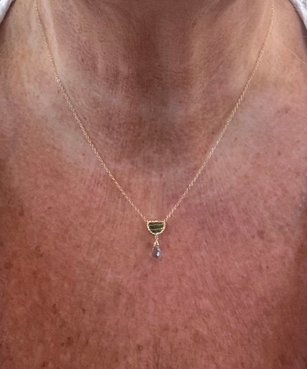 A delicate, feminine piece from jewelry artist Michelle Pressler. Faceted green jade glows with natural vibrancy, while a single aquamarine drop adds a cool, watery shimmer. Suspended on a fine gold-filled chain, this necklace layers beautifully or stands alone as an understated statement. Seen on the hit series The Summer I Turned Pretty, Michelle Pressler’s jewelry has a signature refined sparkle that feels both modern and timeless.