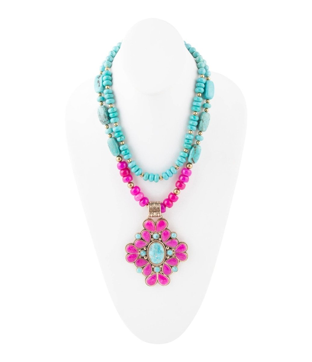 This necklace is made to be noticed—the kind of piece that doesn’t just accessorize, it declares. Hand-crafted with genuine blue turquoise and vivid pink agate, all wrapped in golden bronze, the cross pendant radiates color and charisma in equal measure.