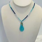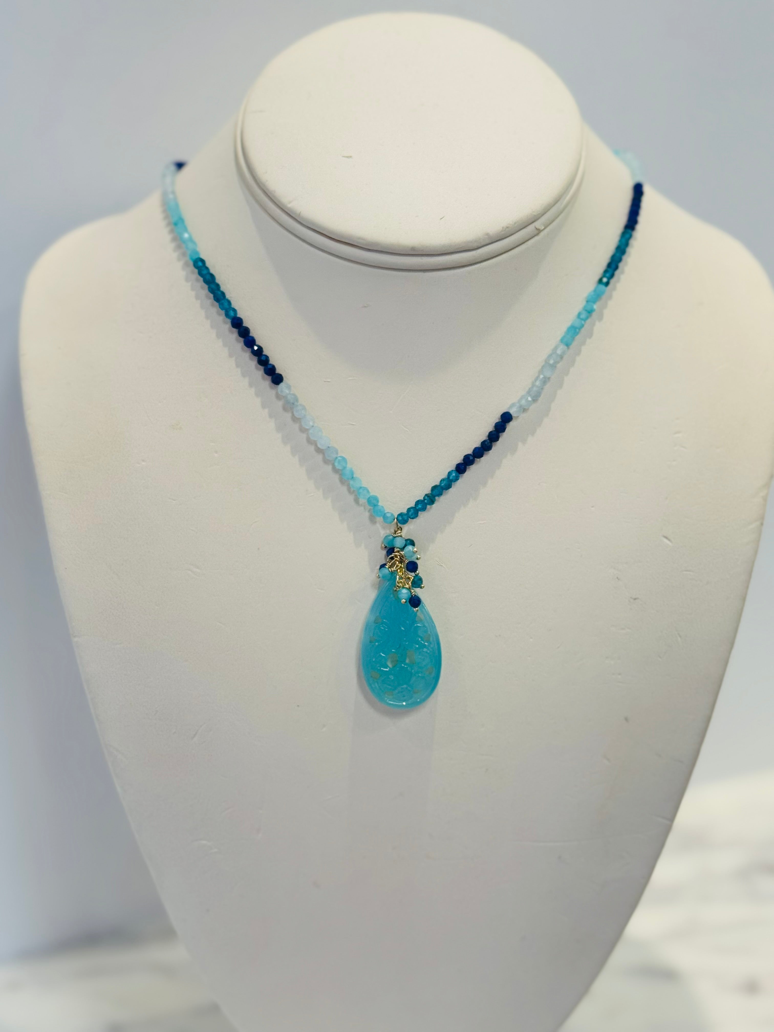 Blue Quartz Pear Carved Pendant With Lapis, Amazonite, Apatite And Aquamarine Rondelles Short Necklace