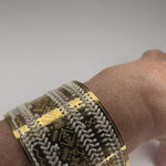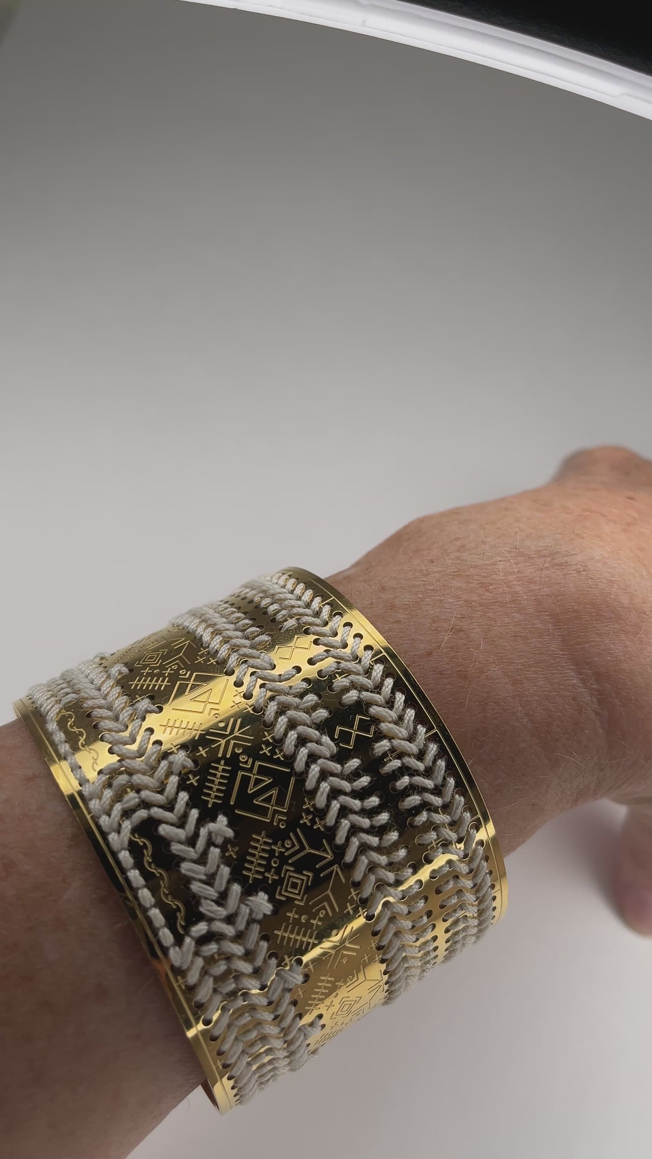 A statement piece that feels like wearable art. This wide cuff is crafted in Italy using a unique perforated base with individualized embroidery technique, creating a rich mosaic-like texture with intricate patterning. The bold, architectural silhouette hugs the wrist with presence and shine, while the handcrafted details keep it grounded in true artisan tradition. This cuff has one embroidery color: matte white.