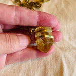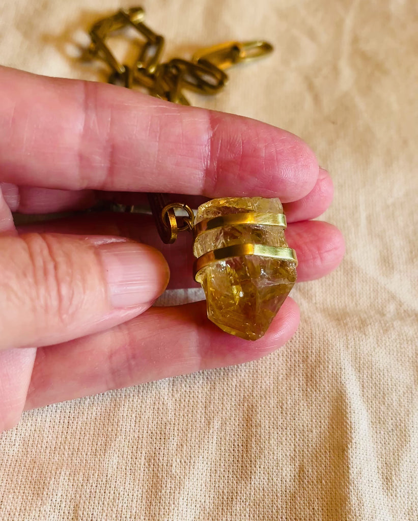 A raw citrine crystal glows with golden fire, captured in a bold bronze setting and suspended from a substantial handcrafted chain. This necklace feels both elemental and elevated — a statement piece that carries warmth, strength, and luminous clarity. Perfect alone or layered, it radiates confidence and grounded beauty.