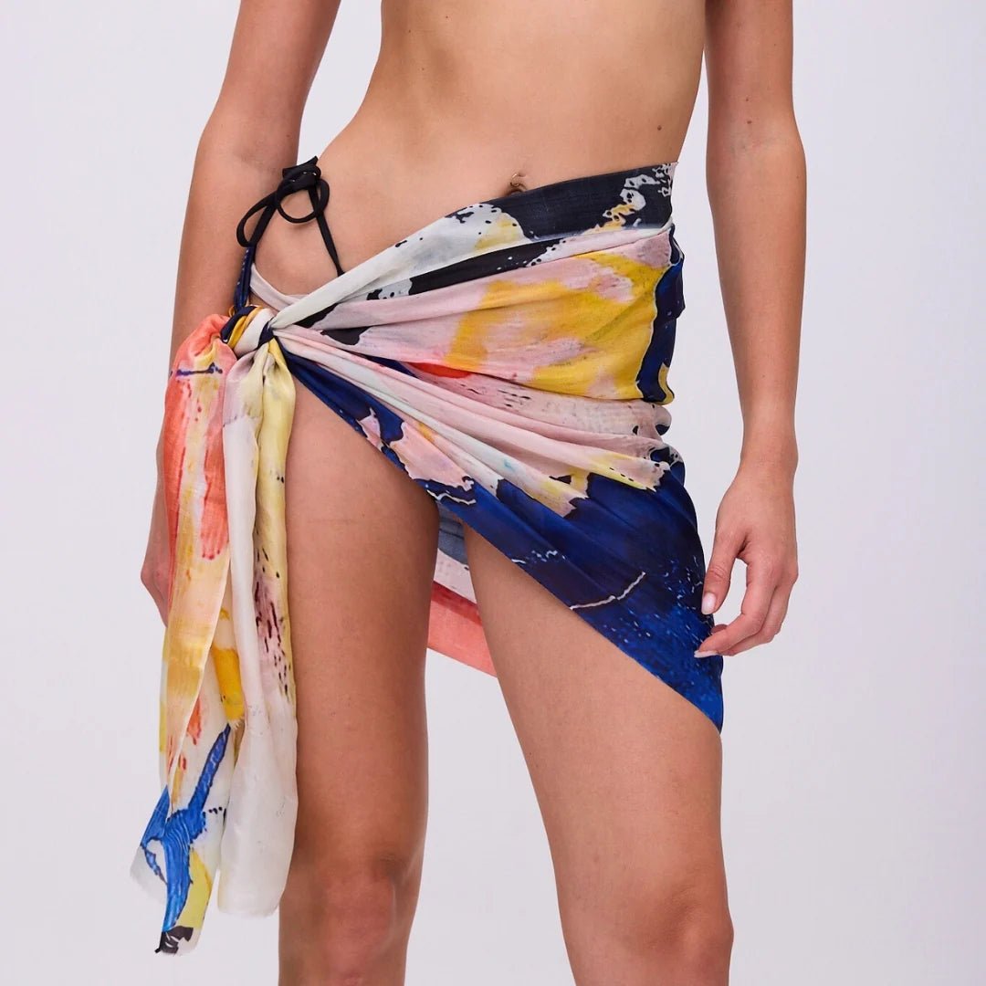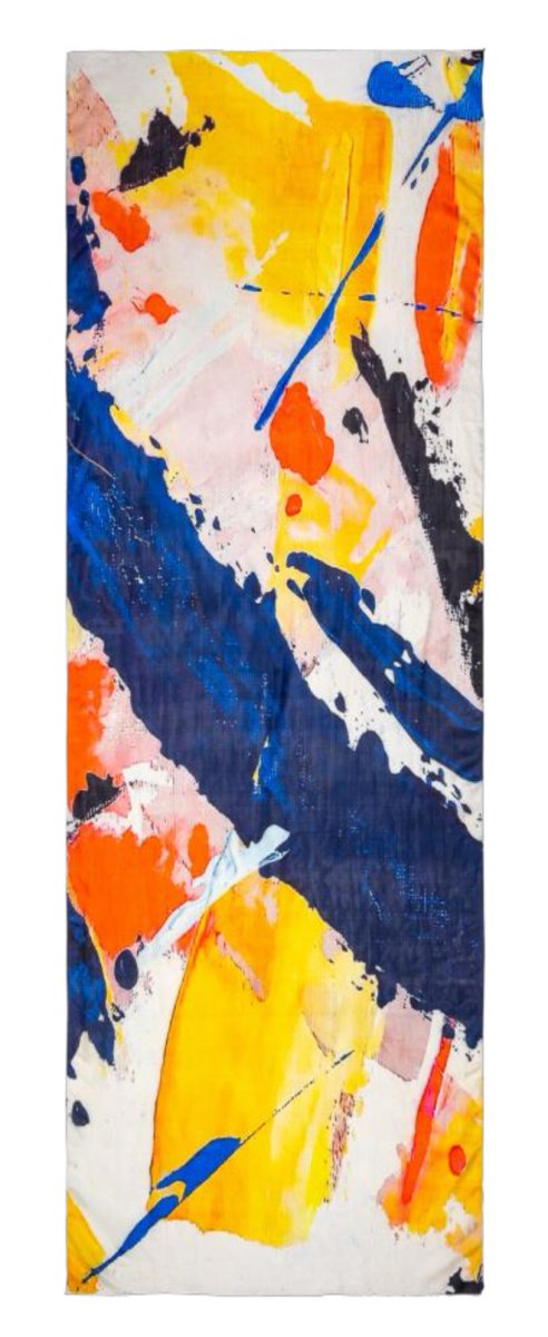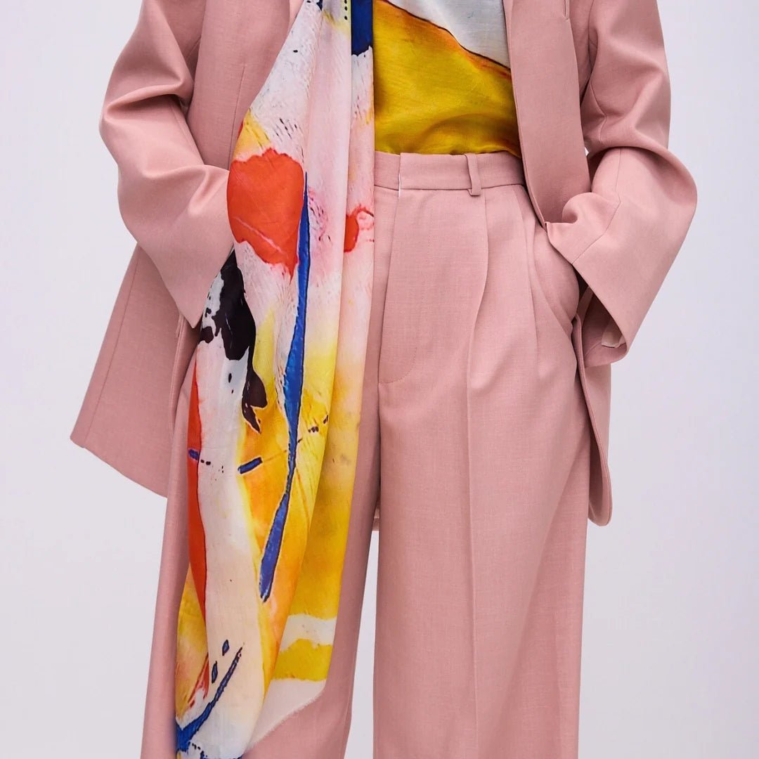 Abstract strokes of cobalt, marigold, and ember move across pure mulberry silk like a storm captured mid-sweep. Lightweight, luminous, and impossibly soft, Hurricane drapes with the ease of art—bringing bold energy to even the simplest silhouette.