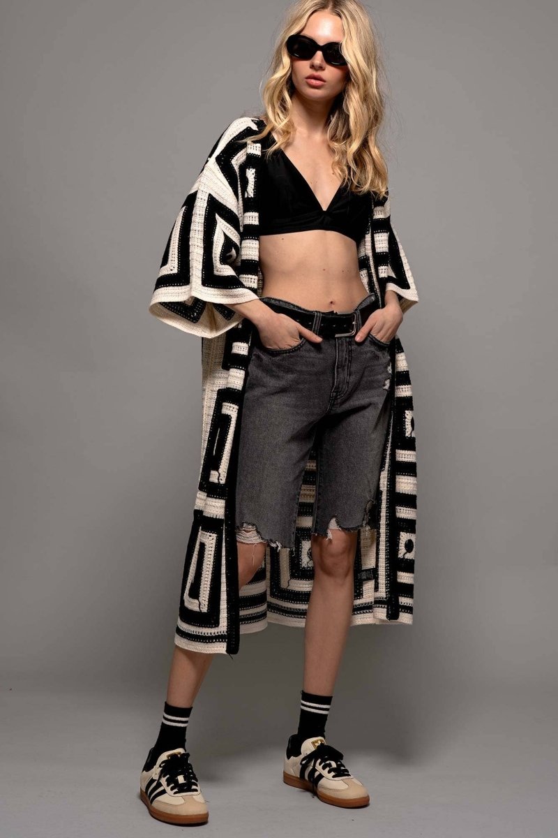 A cardigan that knows how to make an entrance. Bold, geometric crochet squares dance across the fabric like modern art, while the easy open-front design keeps it all feeling effortless. The midi length and relaxed kimono sleeves strike the perfect balance between cozy and chic — a layering piece that plays well with jeans, dresses, and everything in between.
