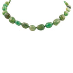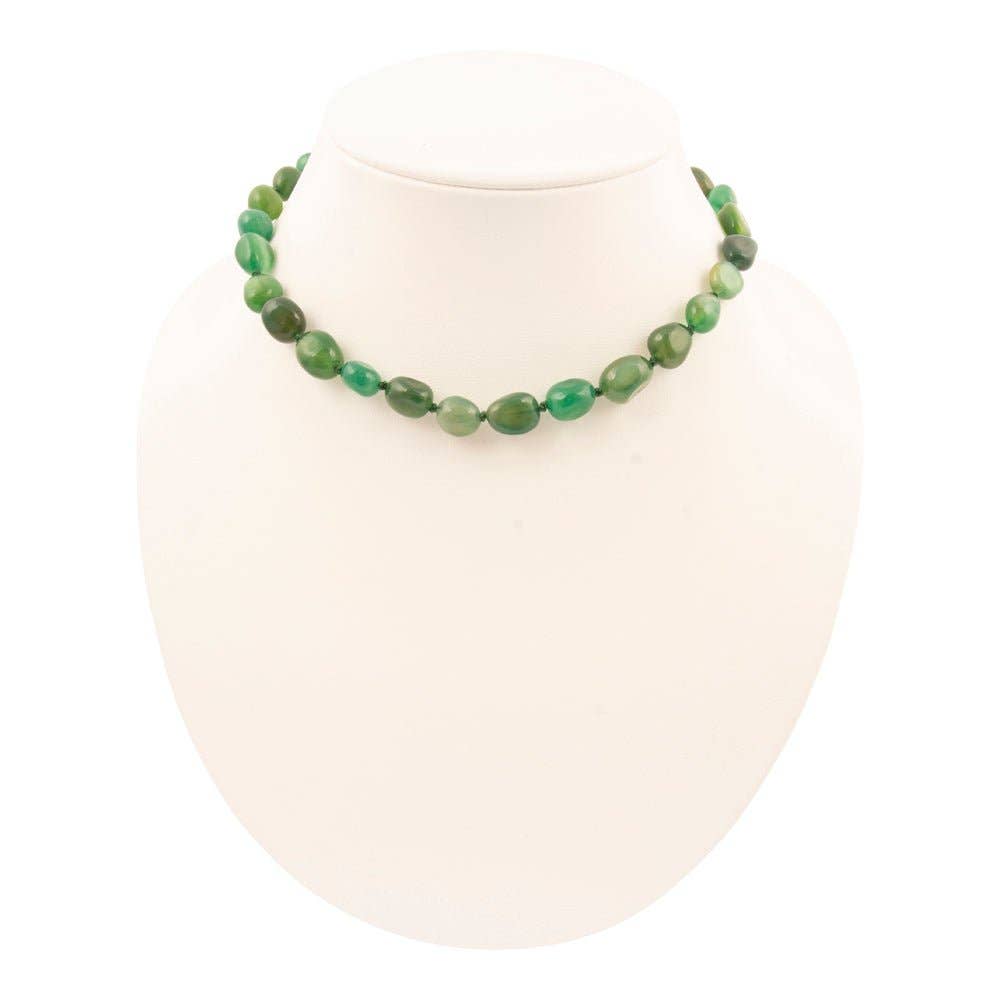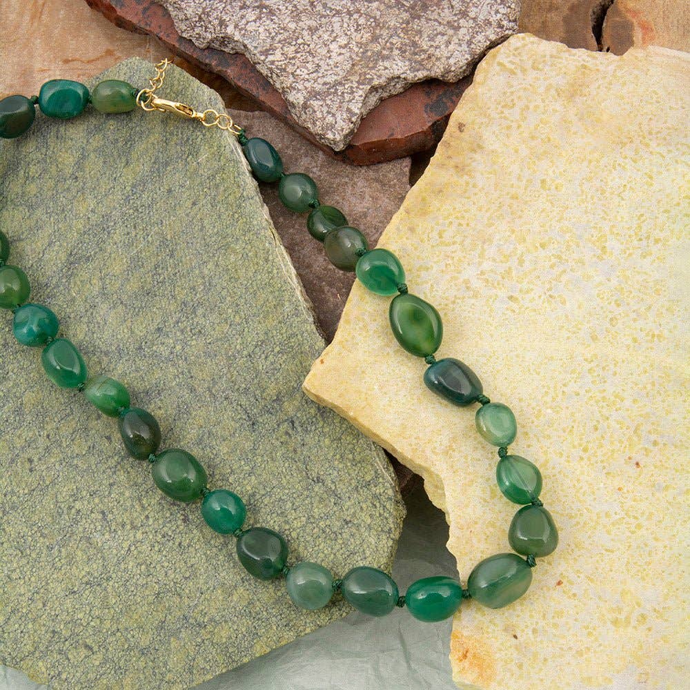 Hand-knotted strands of luminous green agate create a natural rhythm of color and texture in this elegant piece. Each bead is individually knotted for durability and subtle movement, finished with an 18k gold-plated extender and secure lobster clasp.