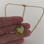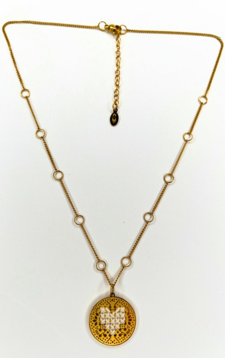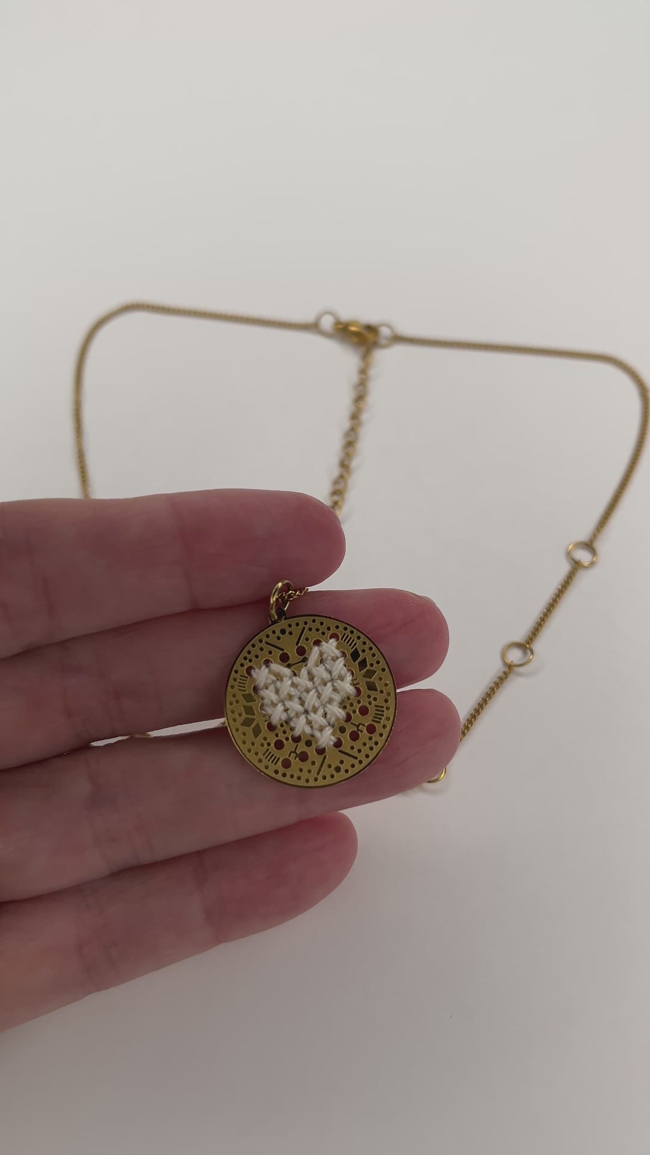 A modern heirloom with a touch of old-world craft. This necklace features a circular mosaic pendant, delicately hand-embroidered using the traditional cross-stitch technique. Each stitch forms a radiant heart motif, bringing warmth and intention into the design.