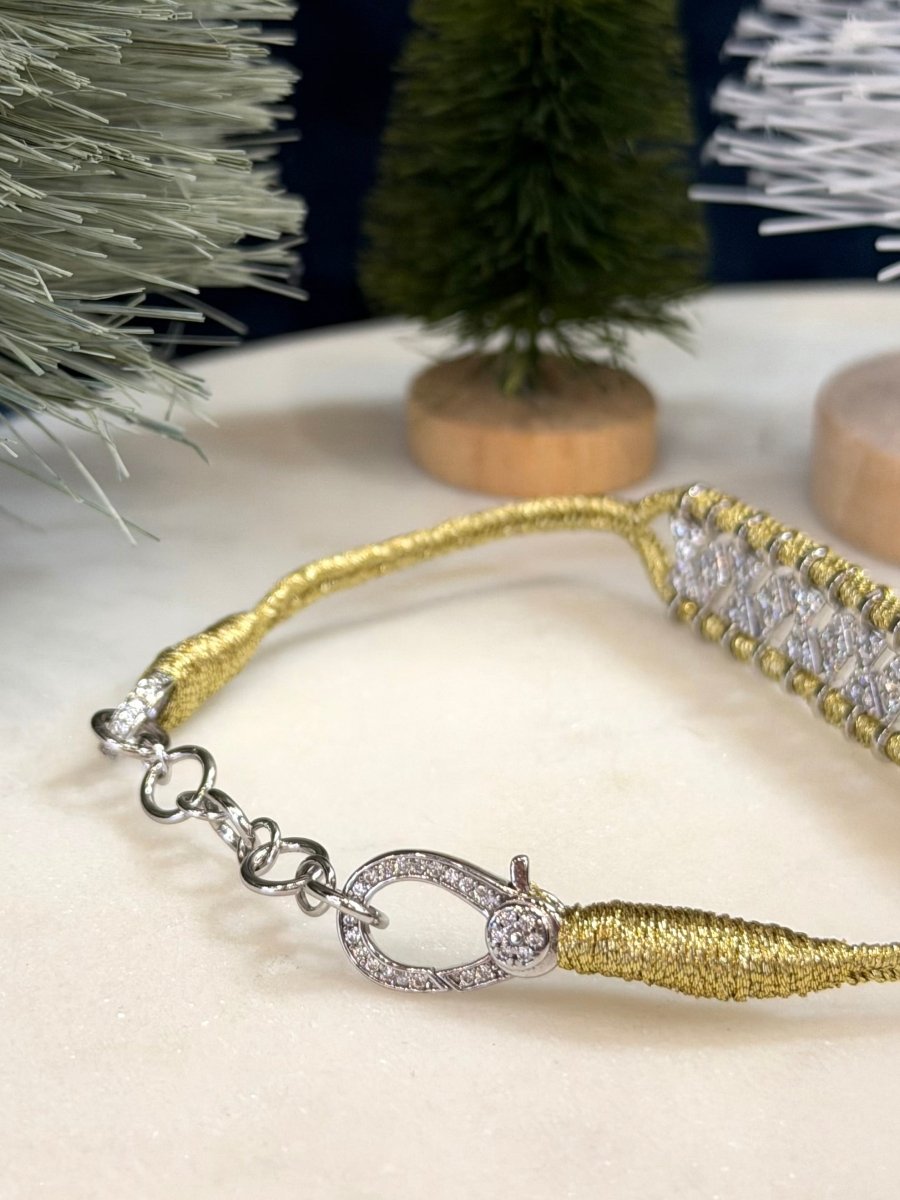 Fine bracelet made of braided lurex thread, decorated with a 925 silver pattern and set with moissanite. Clasp is also 925 silver, rhodium plated with pavé set stones on one side of the lobster clasp.