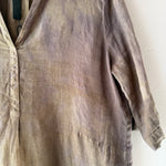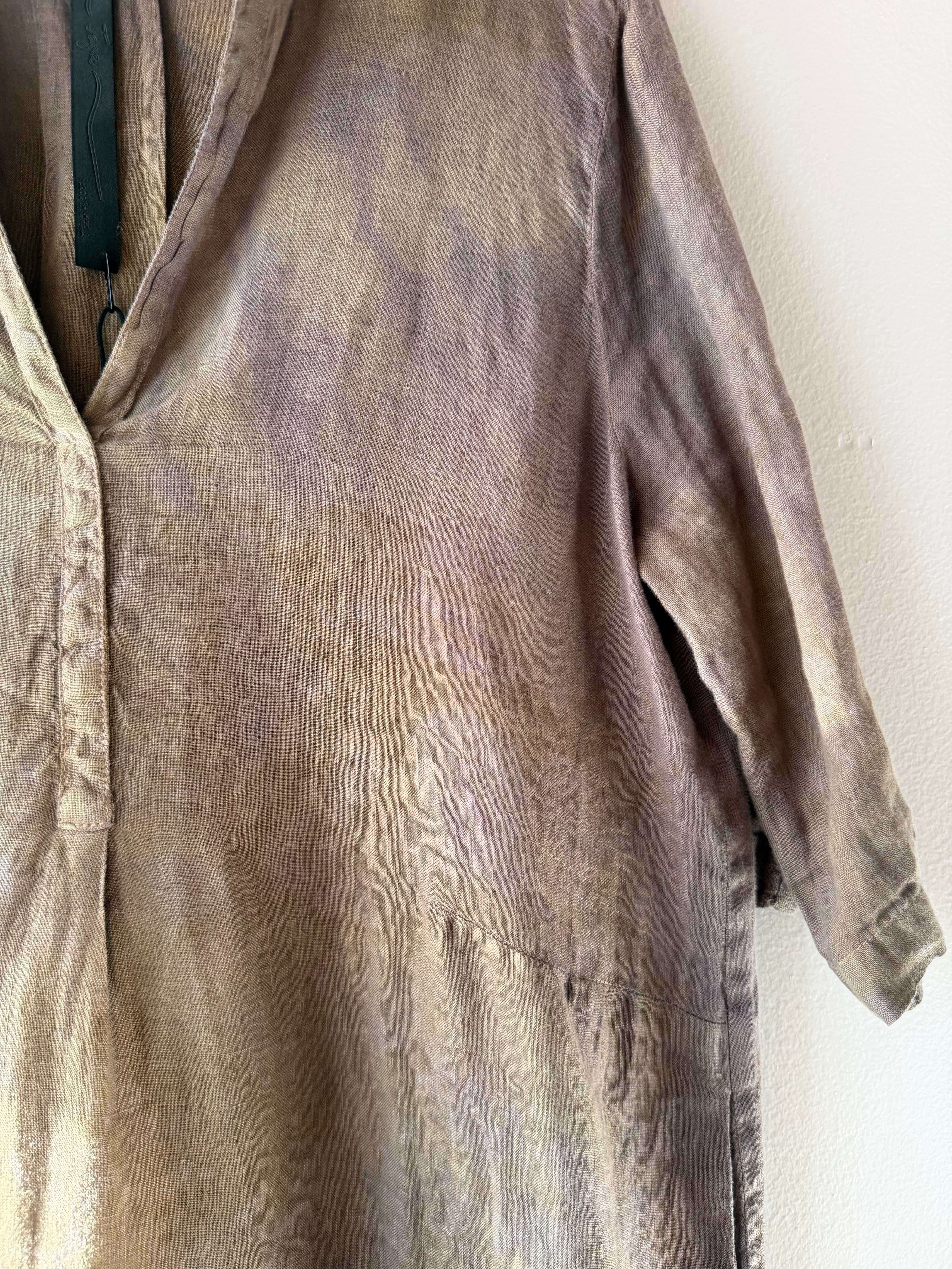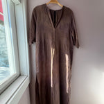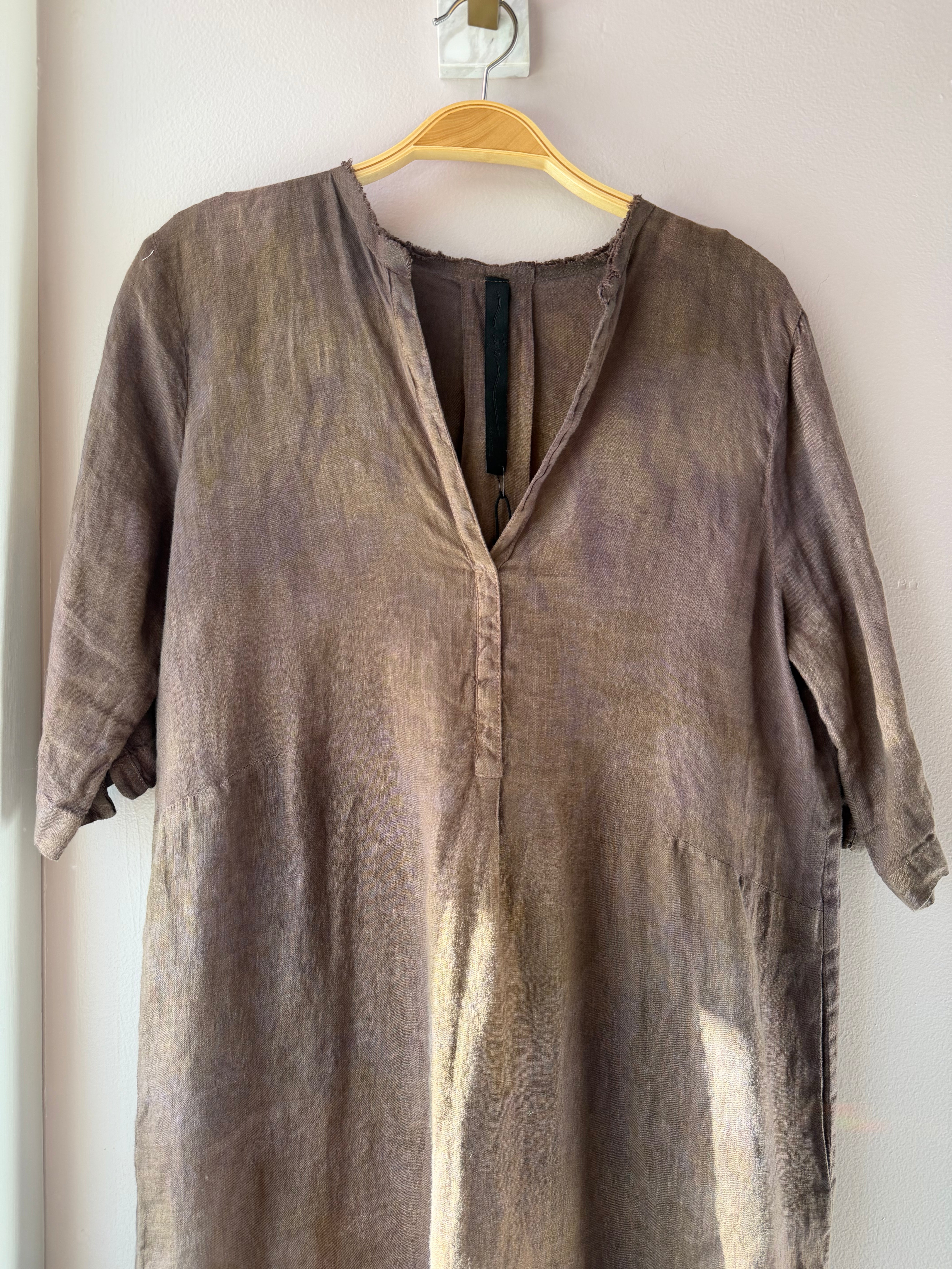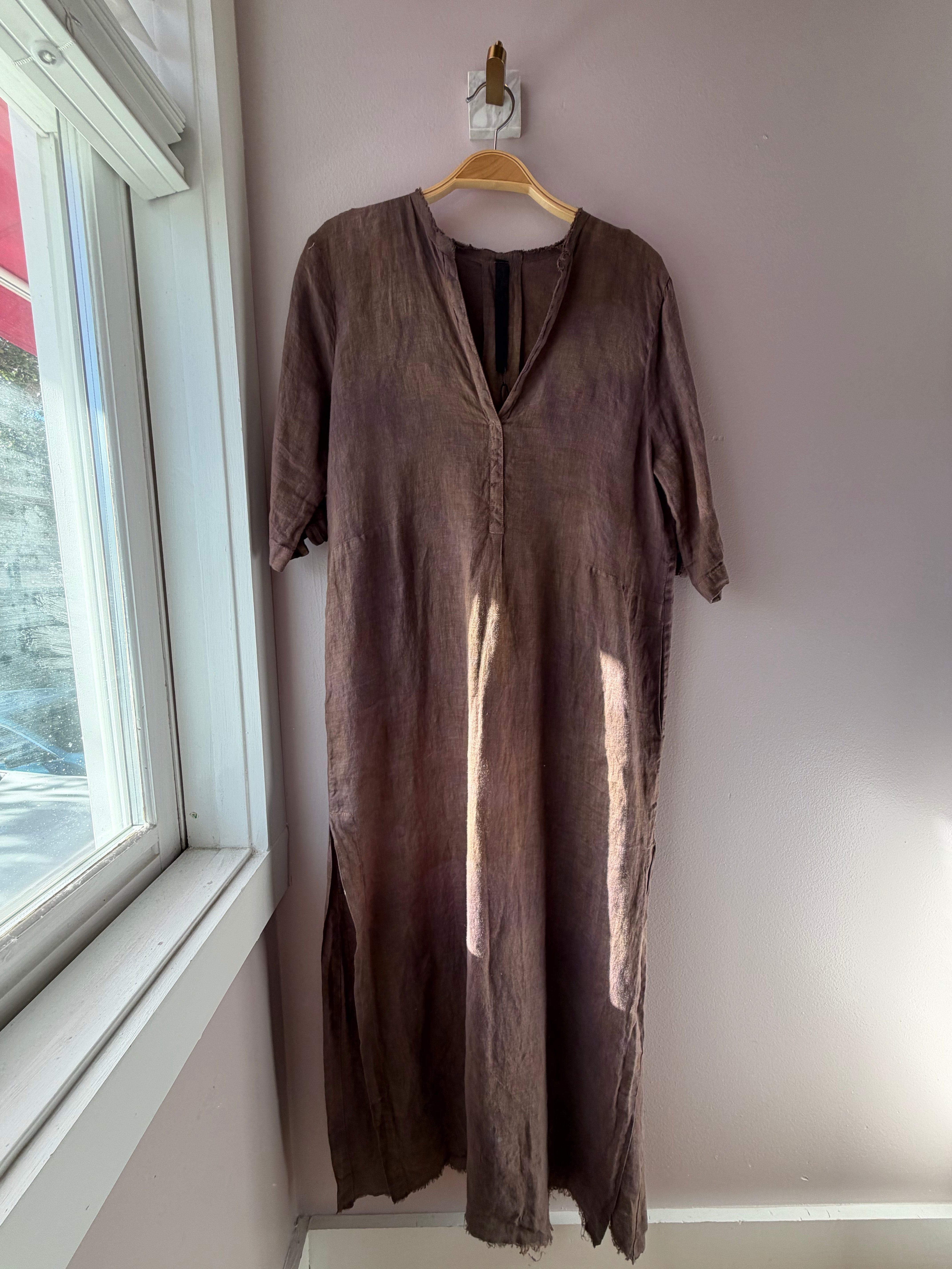 Stunning handcrafted dress in luscious linen. V Neck, Elbow length sleeve, midi length with side slits, color is shitake.
