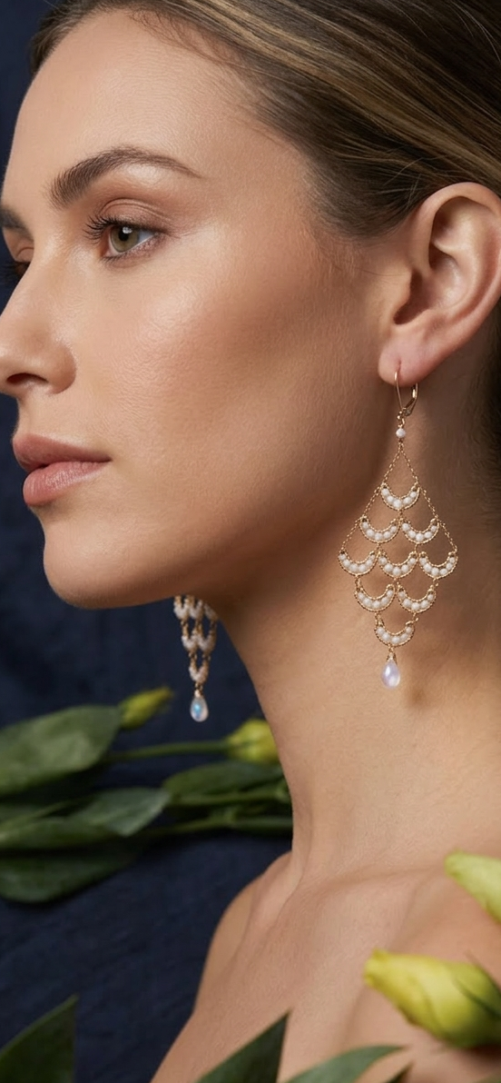 Tiny crescents of freshwater pearls shimmer in layered arcs, forming an elegant chandelier that glows softly with every movement.