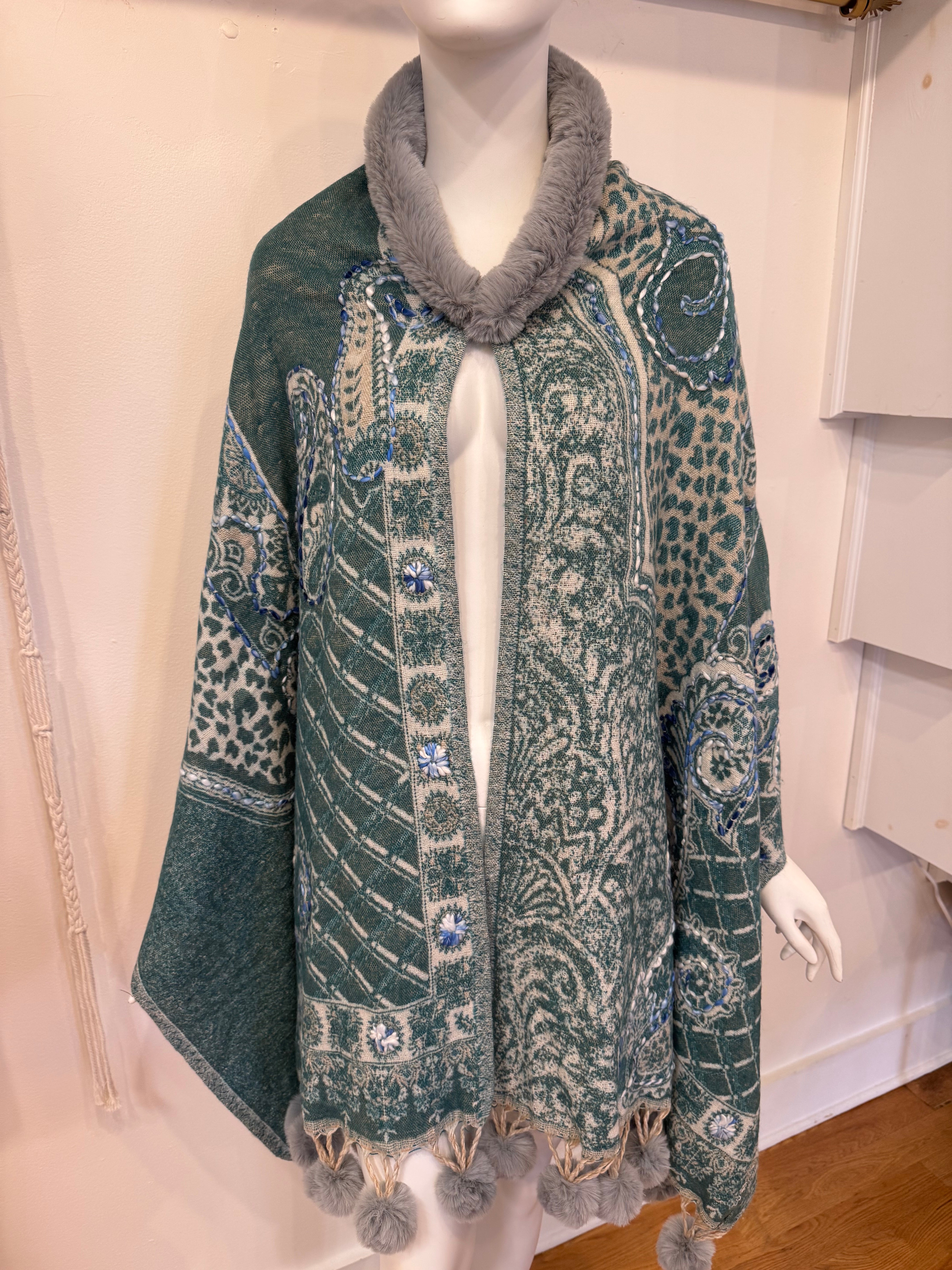 A soft cascade of colors with intricate hand embroidery and playful pom details — this poncho feels as timeless as it does unique. Designed for quiet elegance, it blends artisanal craftsmanship with cozy sophistication. The faux fur trim and fluid drape make it an effortless piece for layering, travel, or elevating everyday denim.