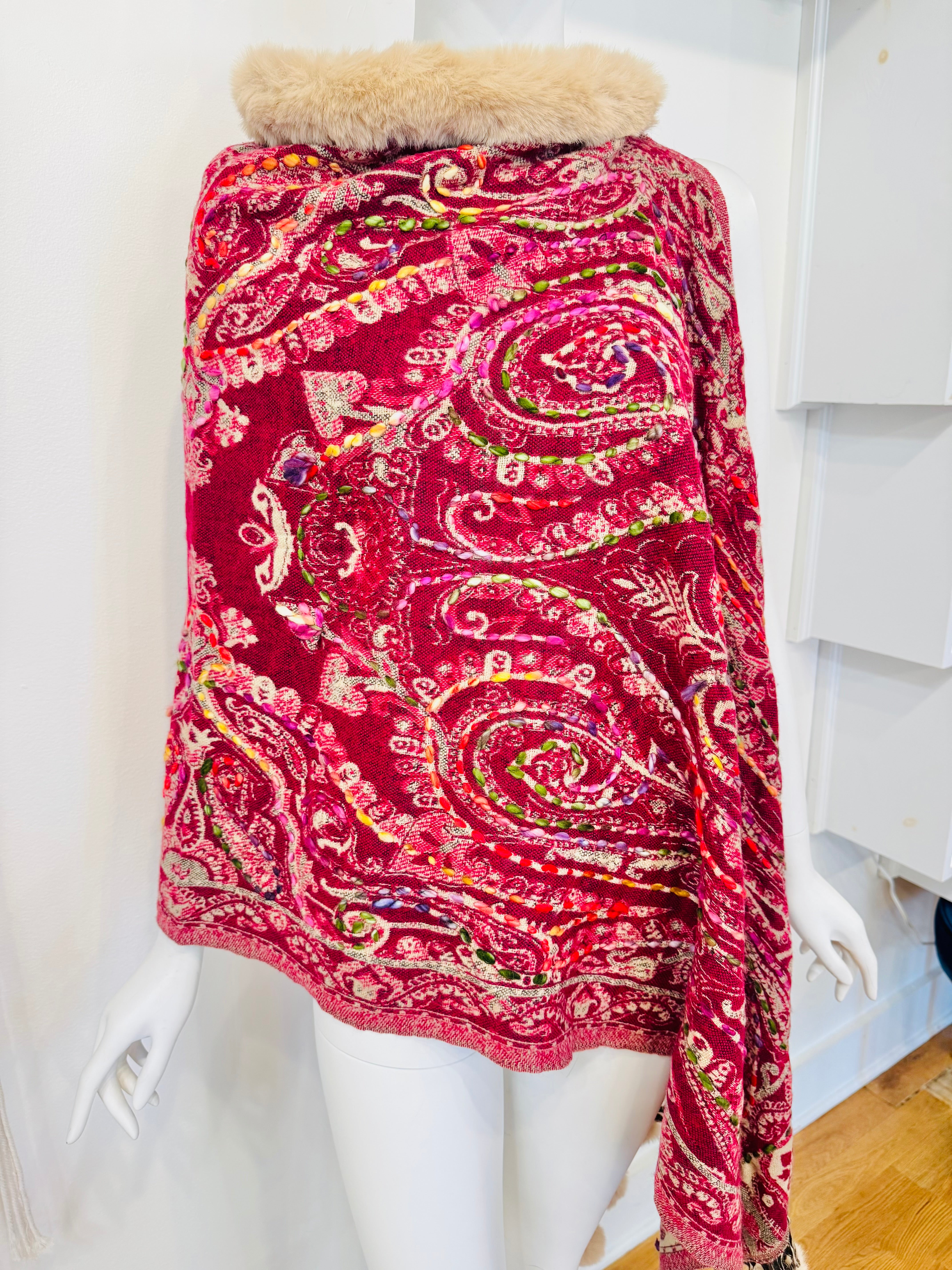 A soft cascade of colors with intricate hand embroidery and playful pom details — this poncho feels as timeless as it does unique. Designed for quiet elegance, it blends artisanal craftsmanship with cozy sophistication. The faux fur trim and fluid drape make it an effortless piece for layering, travel, or elevating everyday denim.