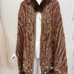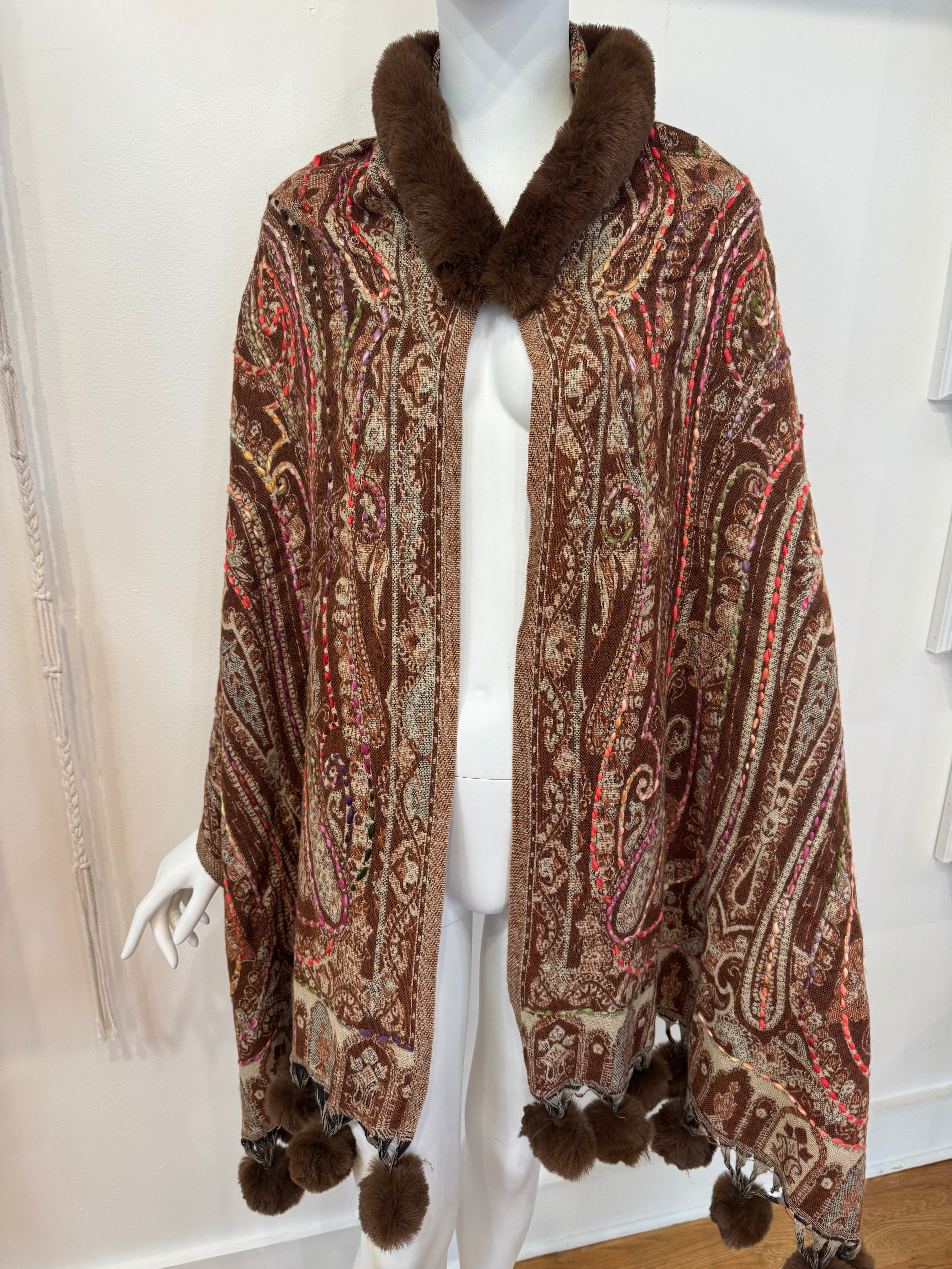 A soft cascade of colors with intricate hand embroidery and playful pom details — this poncho feels as timeless as it does unique. Designed for quiet elegance, it blends artisanal craftsmanship with cozy sophistication. The faux fur trim and fluid drape make it an effortless piece for layering, travel, or elevating everyday denim.