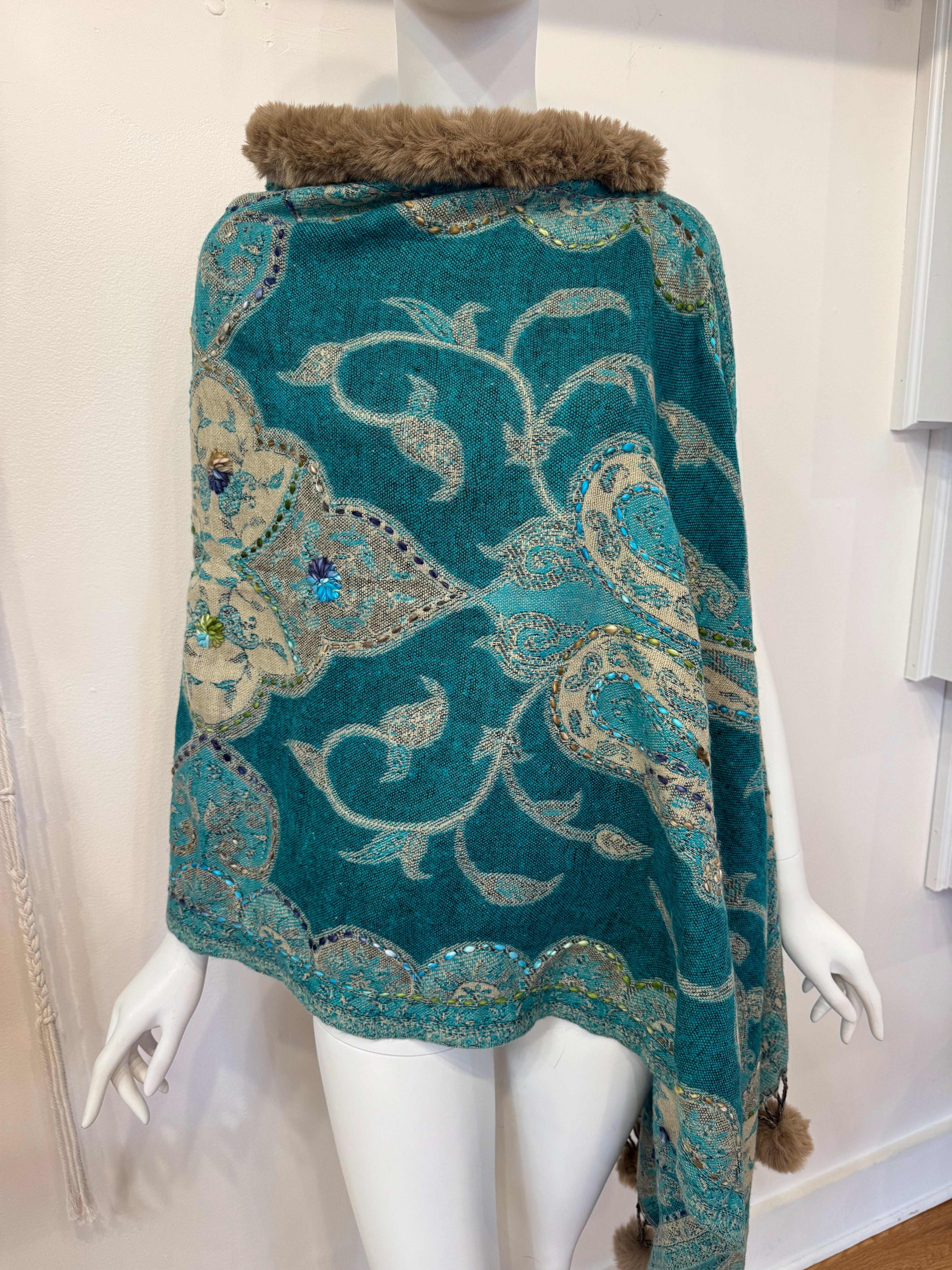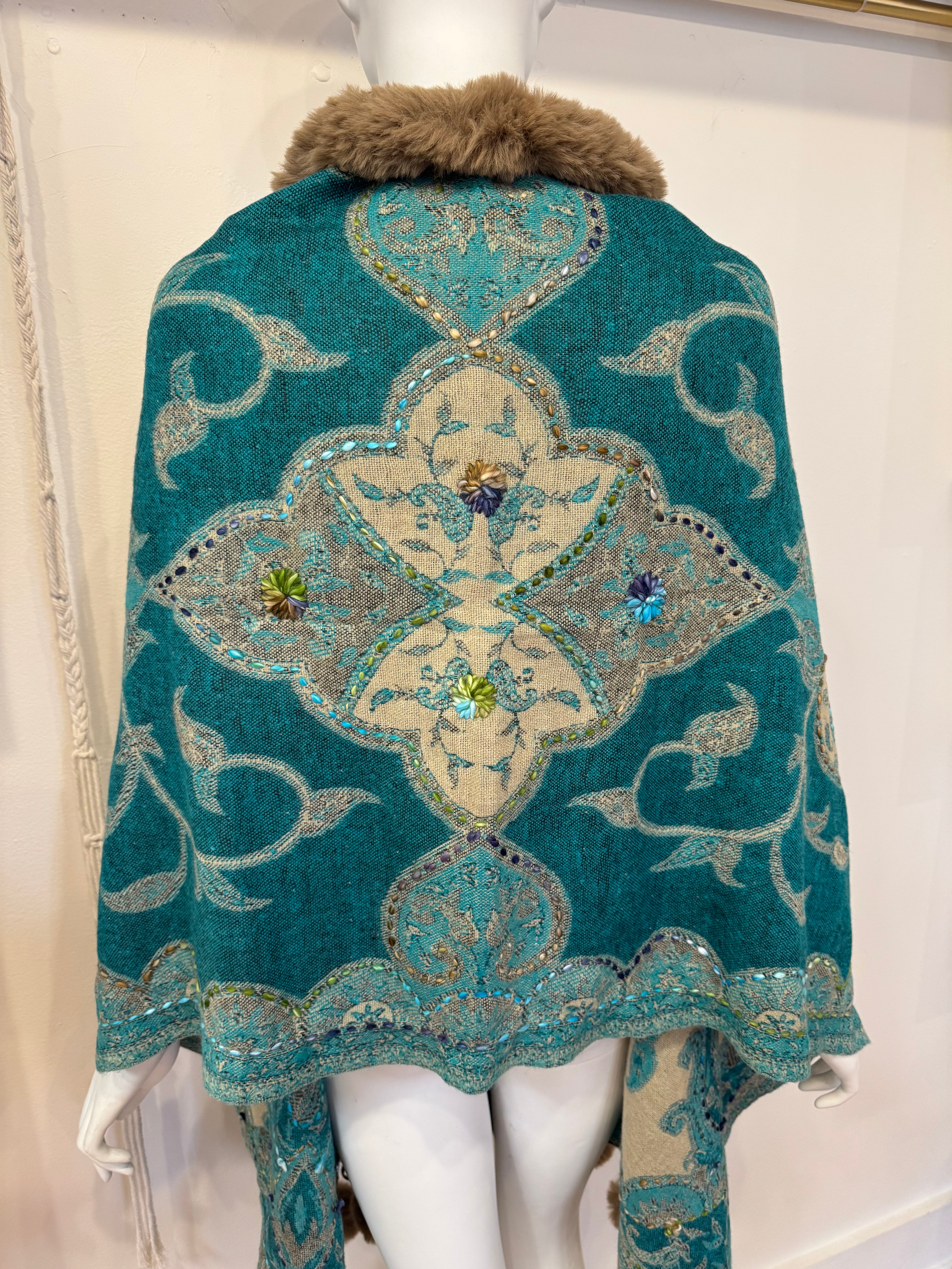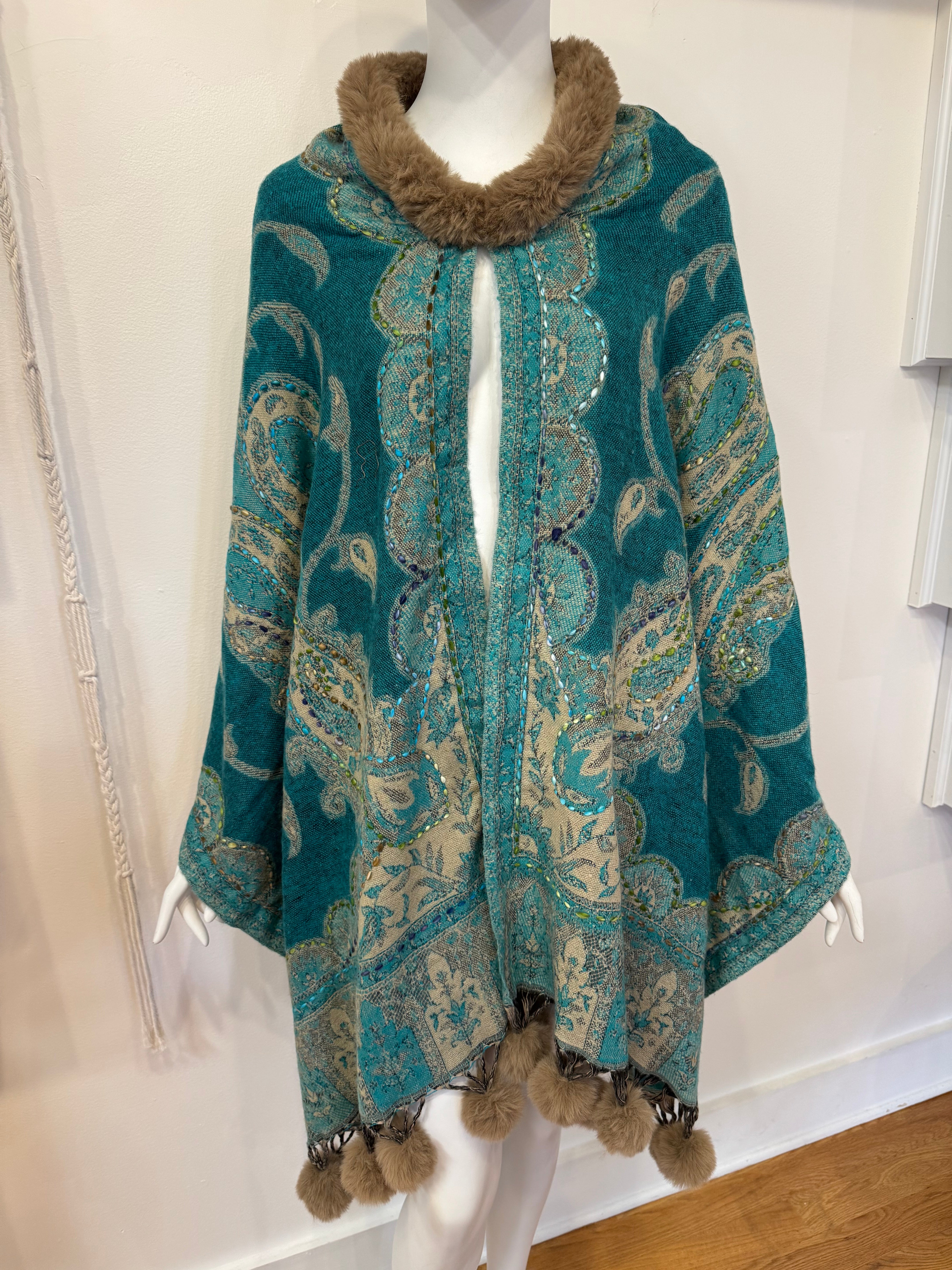 A soft cascade of colors with intricate hand embroidery and playful pom details — this poncho feels as timeless as it does unique. Designed for quiet elegance, it blends artisanal craftsmanship with cozy sophistication. The faux fur trim and fluid drape make it an effortless piece for layering, travel, or elevating everyday denim.