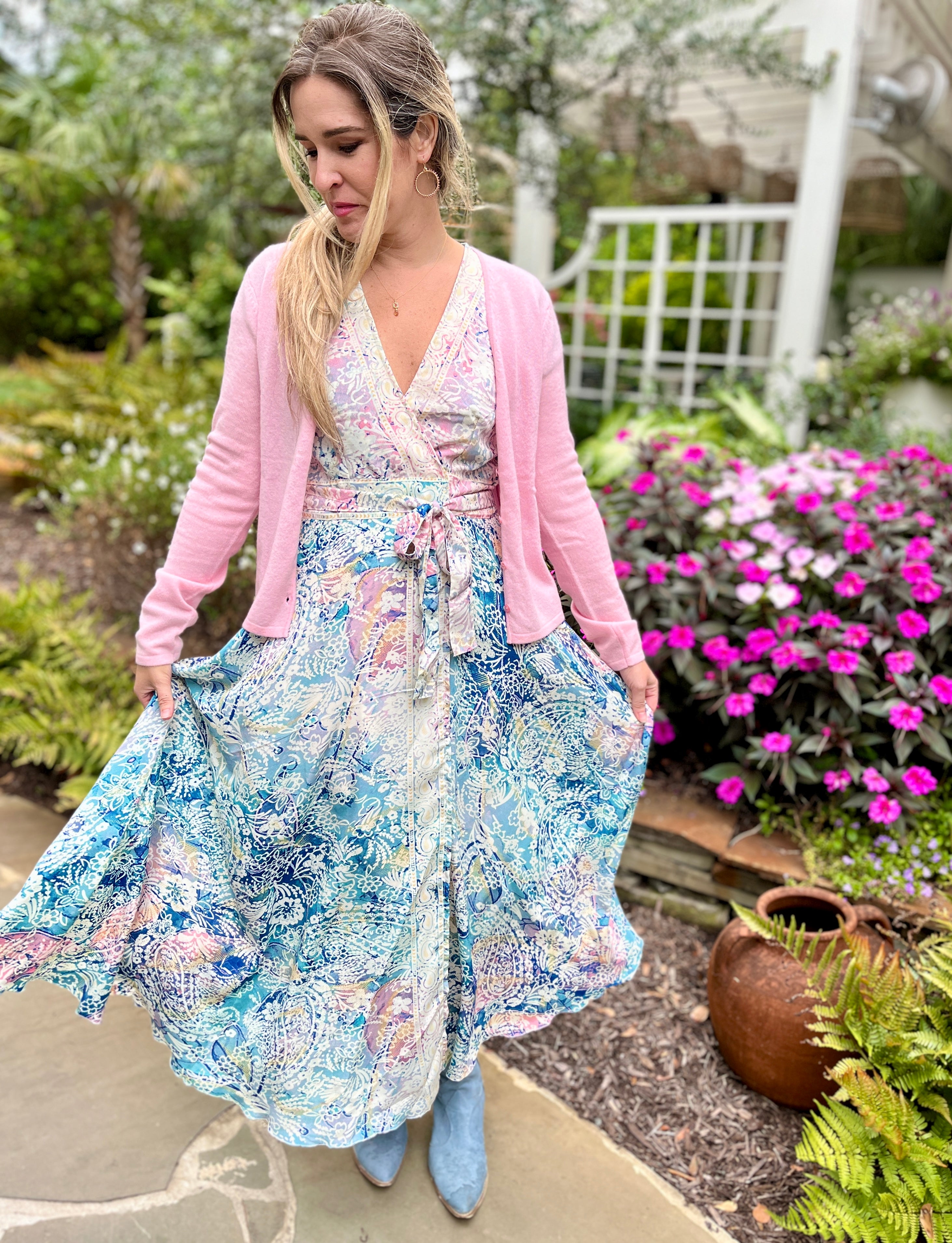 Our best-selling wrap dress, now with a feminine cap sleeve. Each dress is handcrafted from repurposed vintage saris—giving these rich, flowing fabrics a beautiful new life. Designed to flatter all body types with a true wrap fit, this piece cinches at the waist and flows gracefully with every step.
